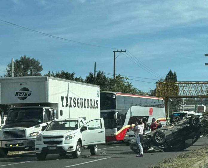 Morelia, Mich.- La volcadura de un automóvil compacto generó movilización de los cuerpos de emergencia sobre la carretera Morelia-Salamanca, a la altura de la embotelladora Aga y la colonia Los Ángeles en la ciudad de Morelia, trascendió en la labor periodística.