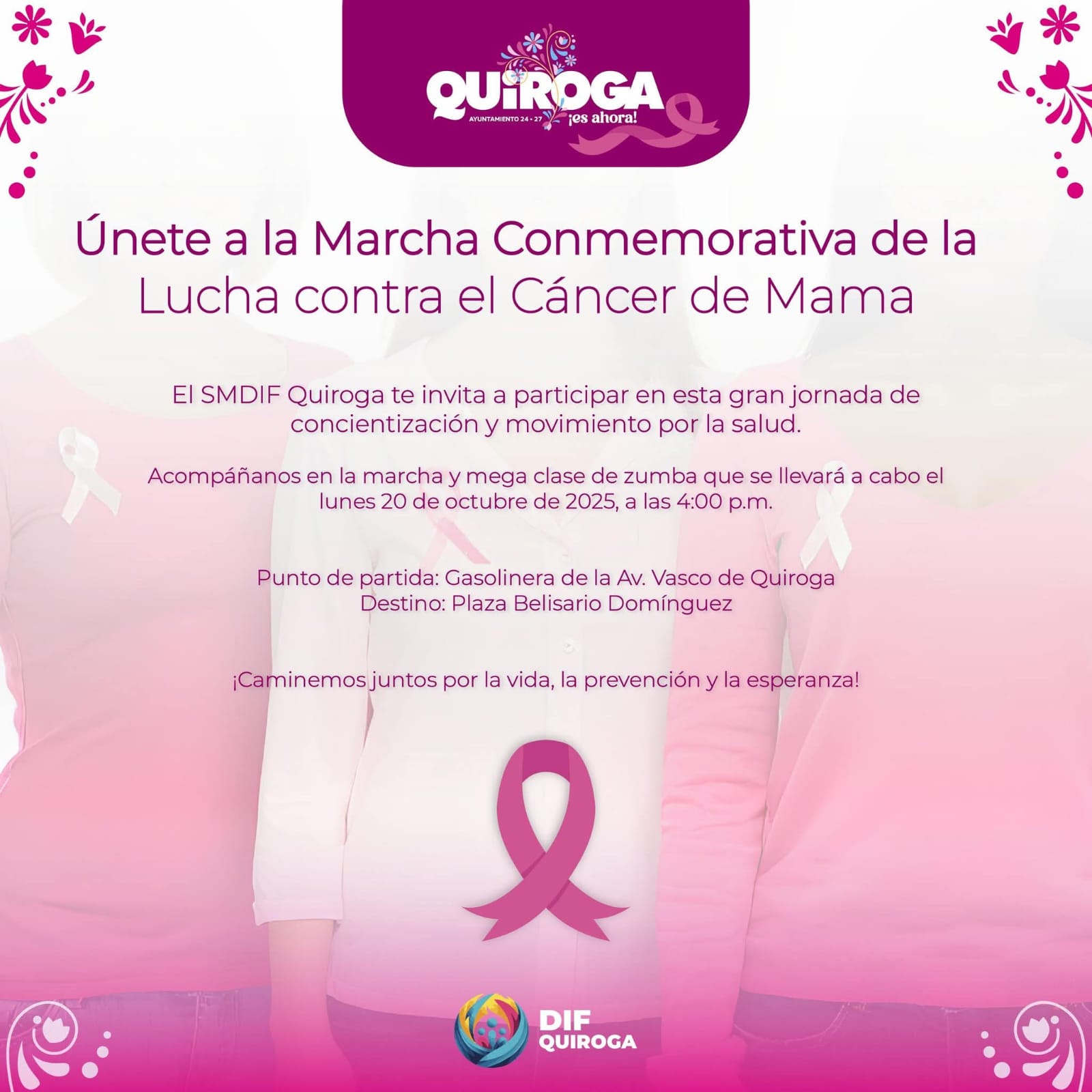 Dicha actividad, que se llevará a cabo el próximo lunes 20 de octubre, es organizada por el Sistema DIF Quiroga, en coordinación con el Ayuntamiento, e invita a toda la ciudadanía a participar en esta gran jornada de concientización y movimiento por la salud, que busca fomentar la prevención y detección oportuna del cáncer de mama, así como el apoyo solidario hacia quienes enfrentan esta enfermedad.