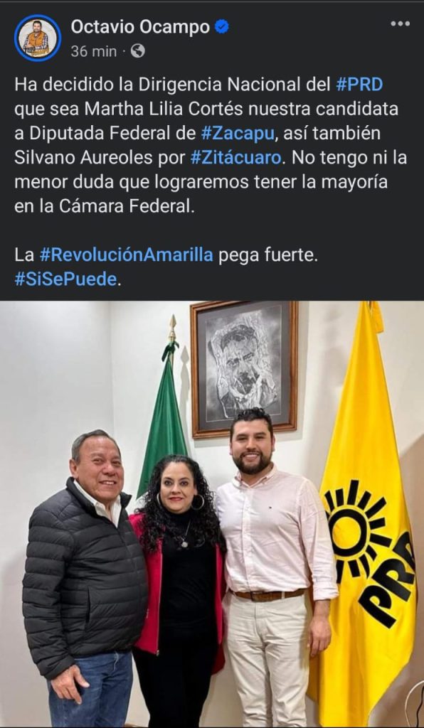 “Ha decidido la Dirigencia Nacional del #PRD que sea Martha Lilia Cortés nuestra candidata a Diputada Federal de #Zacapu, así también Silvano Aureoles por #Zitácuaro. No tengo ni la menor duda que lograremos tener la mayoría en la Cámara Federal”, refirió en sus redes sociales.}