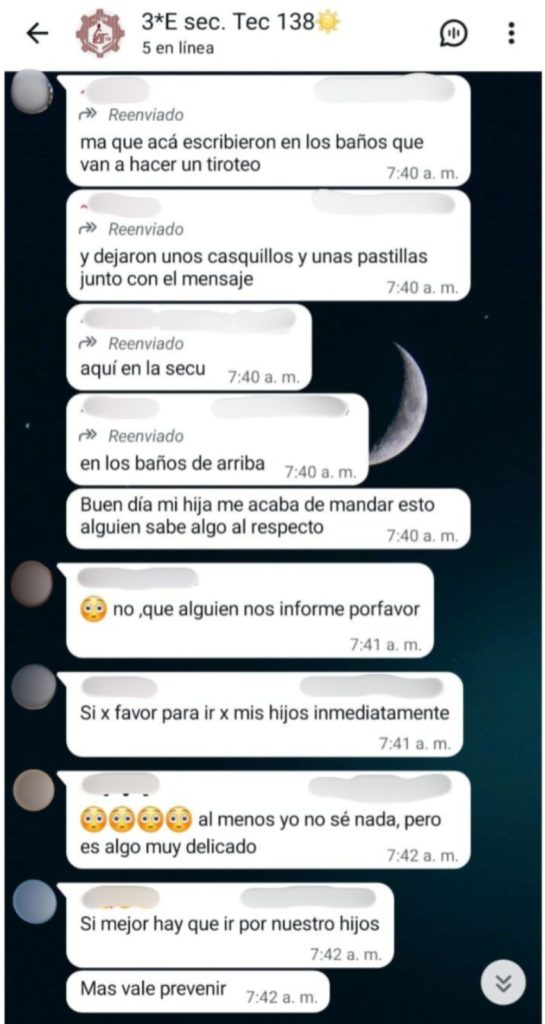 De acuerdo con testimonios de la comunidad educativa, los mensajes fueron encontrados en el área de baños, junto con restos de proyectiles de arma de fuego, lo que incrementó la preocupación por los riesgos dentro de las escuelas, aunque la Secretaría de Seguridad Pública de Michoacán informó después que no encontraron casquillos.