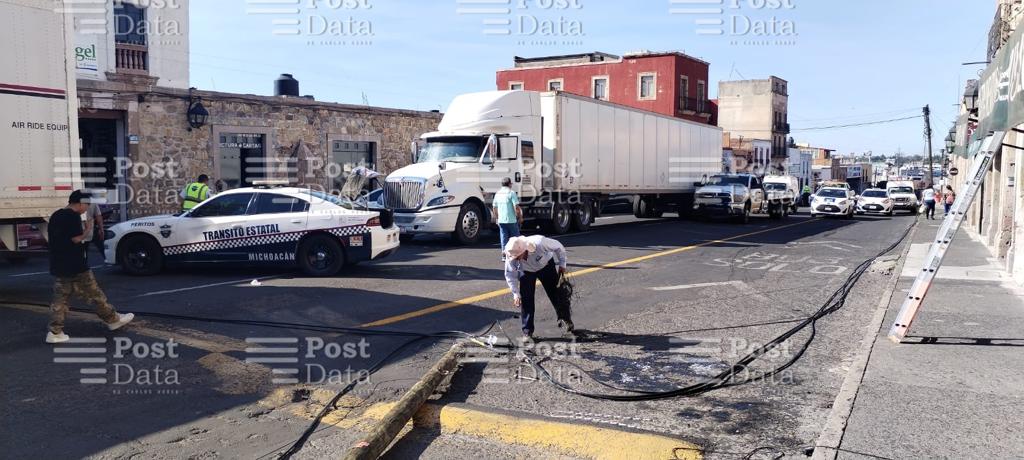 Morelia, Mich.- Un auto terminó dañado al caerle encima un poste de madera que fue derribado por un tráiler sobre la avenida Morelos Norte, informaron autoridades policiales.