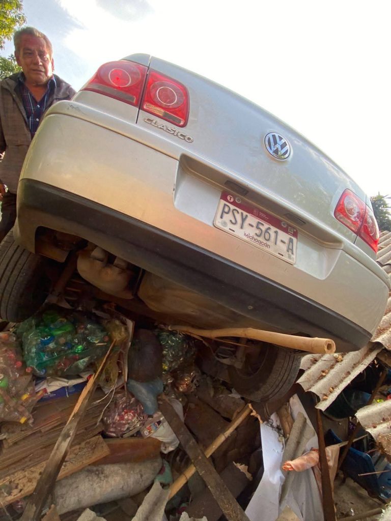 Tras choque con motocicleta, auto termina en el techo de una vivienda en Zitácuaro
