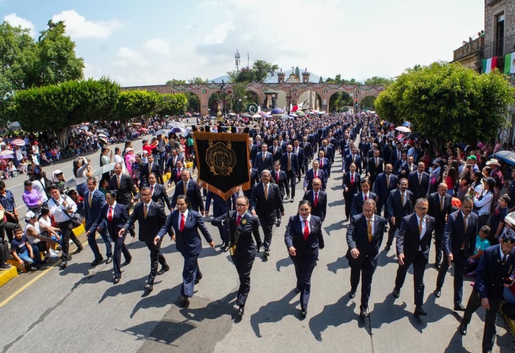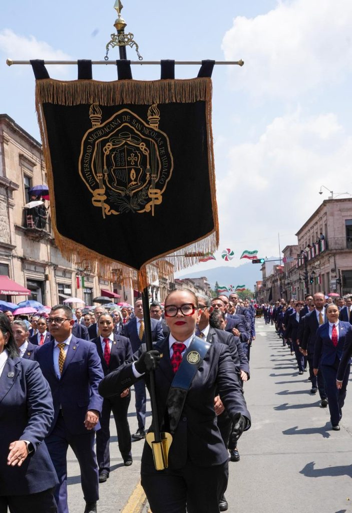 La delegación nicolaita representada por más de 900 docentes, administrativos, directoras, directores, funcionarias, funcionarios, estudiantes y exalumnos, así como por la reconocida Banda de Guerra, desfilaron mostrando una vez más que la Universidad Michoacana no sólo forma profesionales, sino también ciudadanas y ciudadanos comprometidos con su historia y su gente.