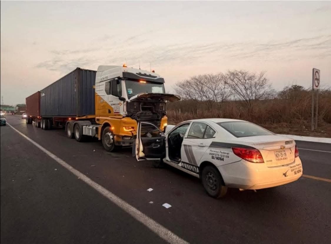 De acuerdo con la información preliminar, aparentemente el auto, un Chevrolet Aveo de color blanco con matrícula NZV-25-19, con rótulos de Seguridad Privada, trató de rebasar e impactó de frente contra un camión de carga con doble remolque.