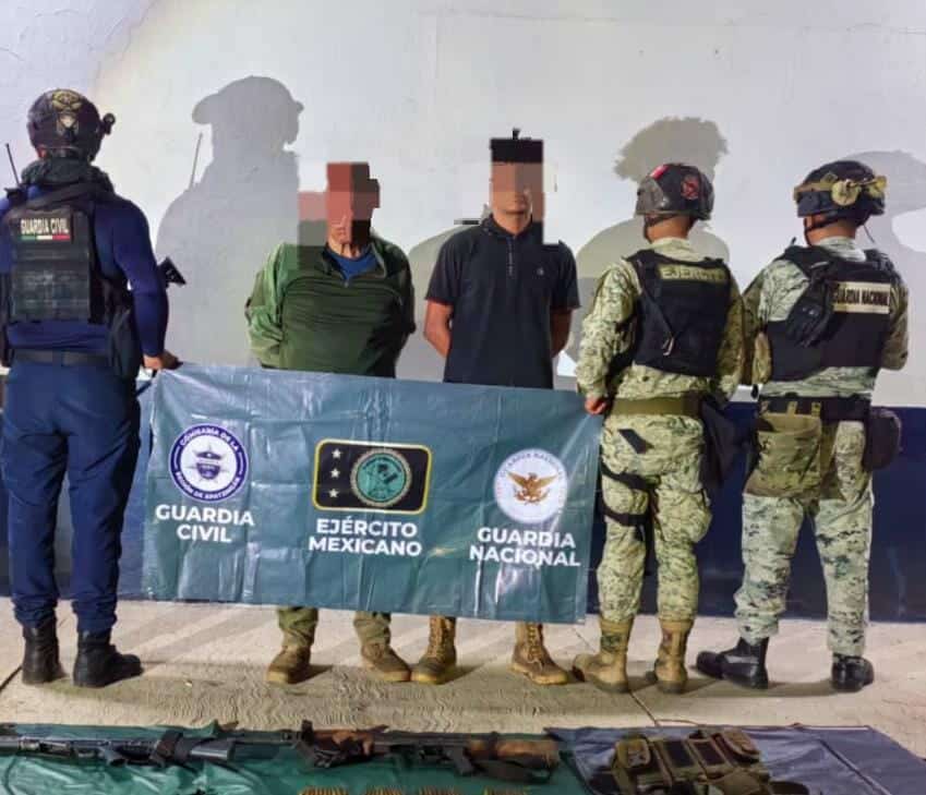 En el área las autoridades detuvieron a dos individuos identificados como César H., de 18 años y origen venezolano, alias “El Chino”, y Juan C., de 55 años, alias “El Rey”, a quienes les aseguraron armamento de alto poder y diverso equipo táctico.