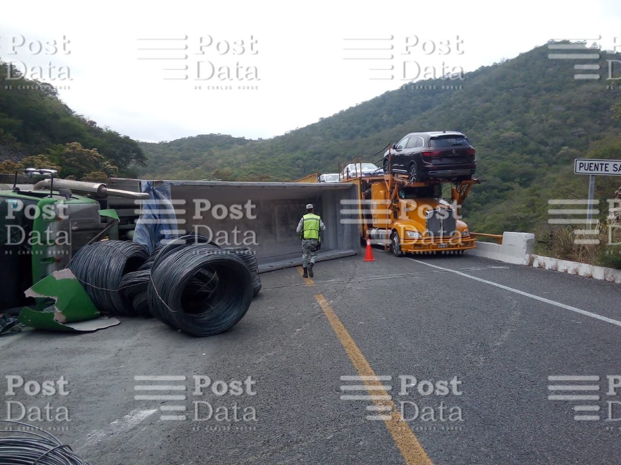 Arteaga, Mich.- Un tráiler cargado con rollos de alambre volcó, sobre la autopista Siglo XXI, sin que por fortuna se tenga reporte de personas lesionadas, sin embargo el accidente ocasionó el cierre parcial de la transitada carretera.